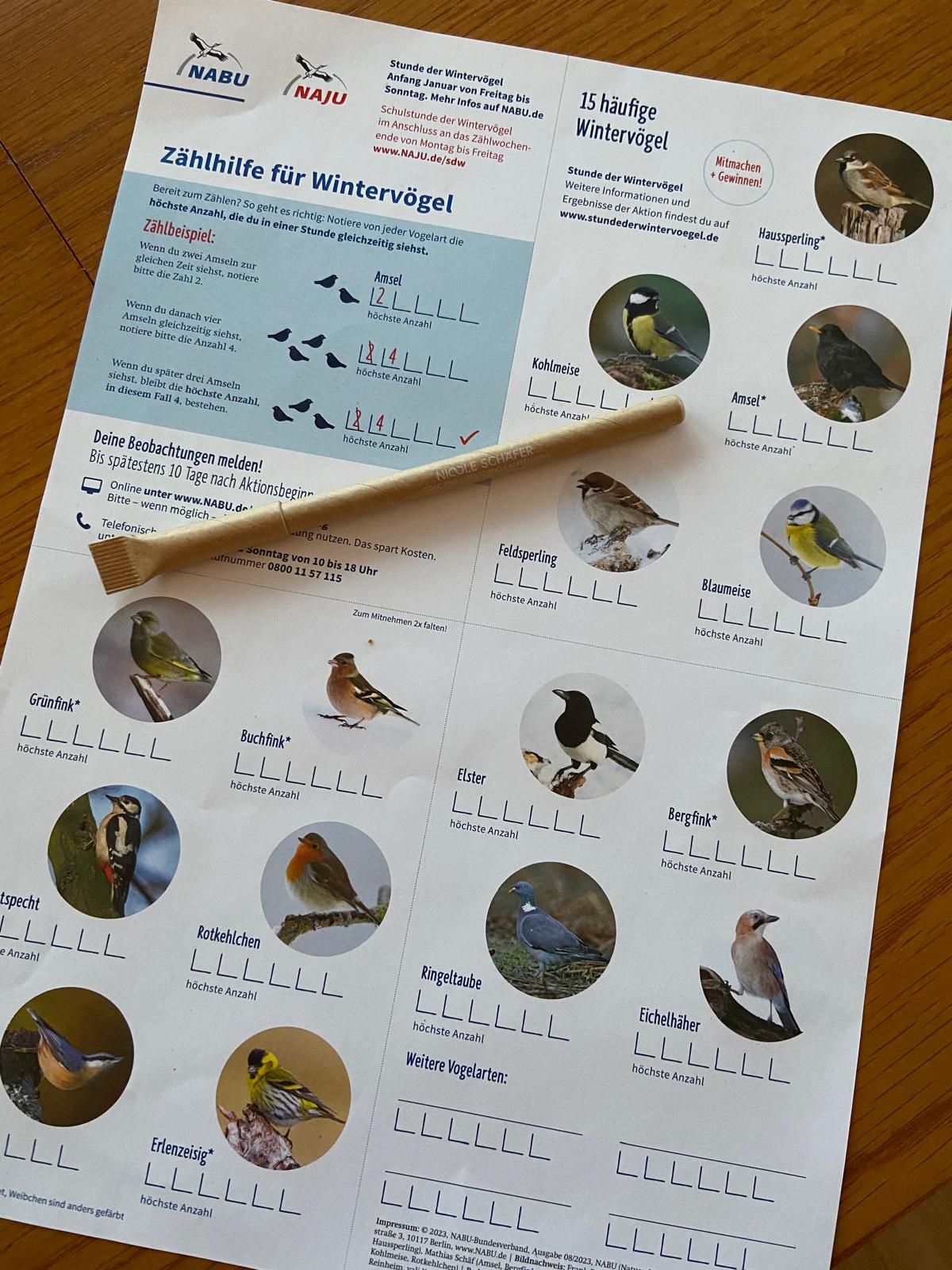 chüler*innen des 5. Jahrgangs haben Informationen zur „Stunde der Wintervögel“ von Biologielehrerin Frau Ernst erhalten und jeweils eine Zählhilfe mit Bild zur Vogelbestimmung. Dadurch hatten sie die Möglichkeit an der Zählung der Wintervögel, zum Beispiel Grünfink, Elster, Bergfink, Kohlmeise, Amsel, Blaumeise, Ringtaube, Rotkehlchen, Haussperling und Erlenzeisigvon zu Hause aus teilzunehmen. Eine gute Sache mit der man den NABU bei seiner Arbeit unterstützen kann.