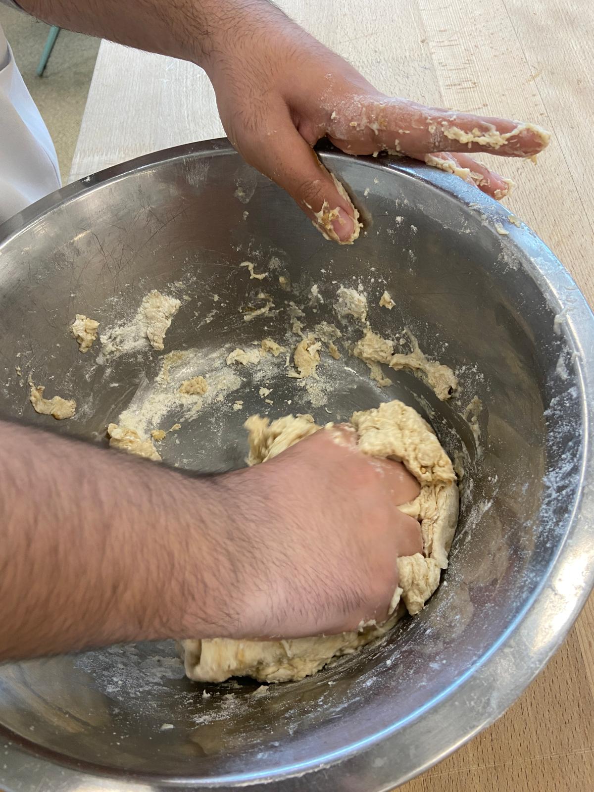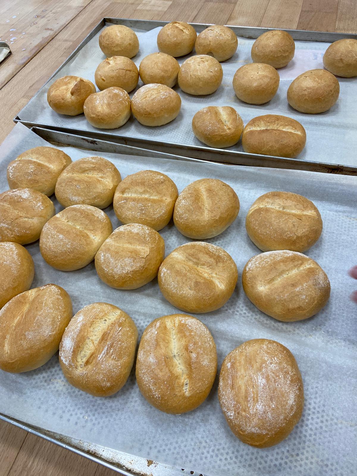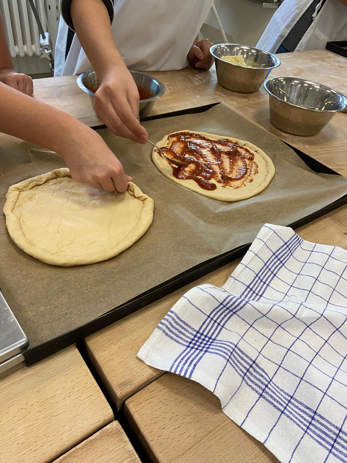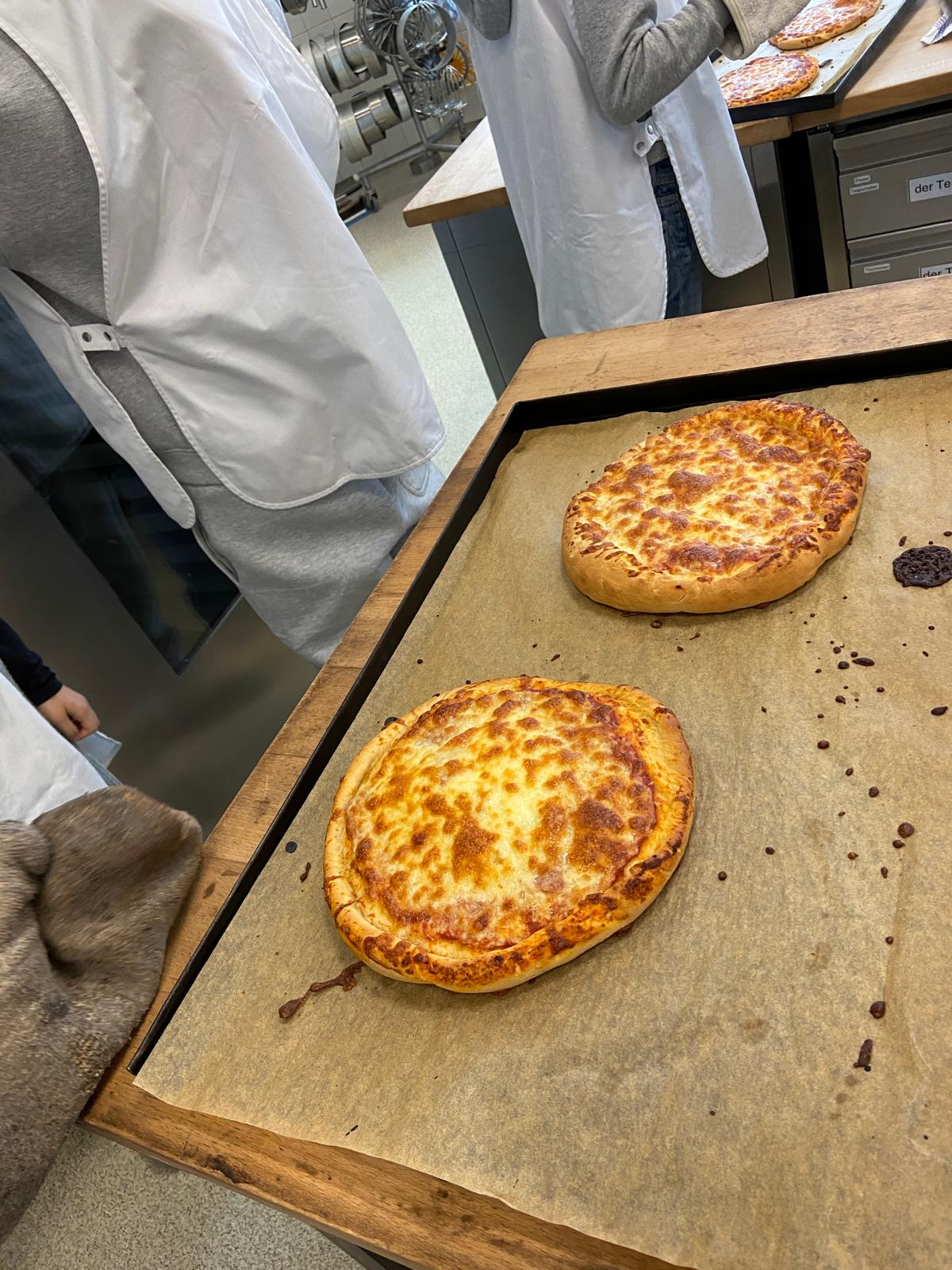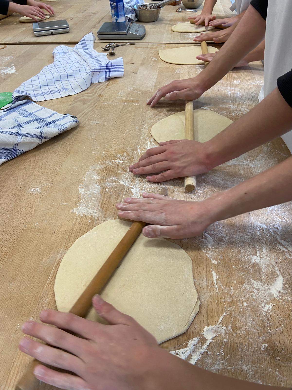 An allen Tagen arbeiteten wir intensiv praktisch. Wir stellten verschiedene Teigarten her und lernten unterschiedliche Backtechniken kennen. Zu den Backwaren, die wir herstellten, gehörten unter anderem Hefezöpfe, Weizenbrötchen, Amerikaner und Mandelhörnchen. Außerdem bereiteten wir für jeden eine Pizza aus Hefeteig zu, was uns besonders viel Spaß machte.