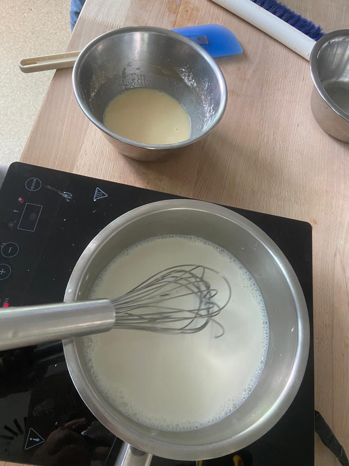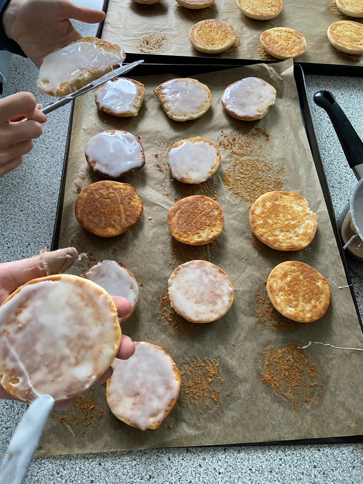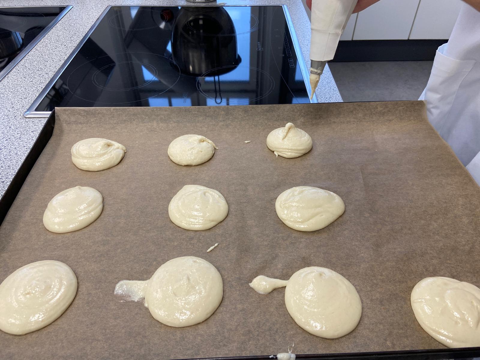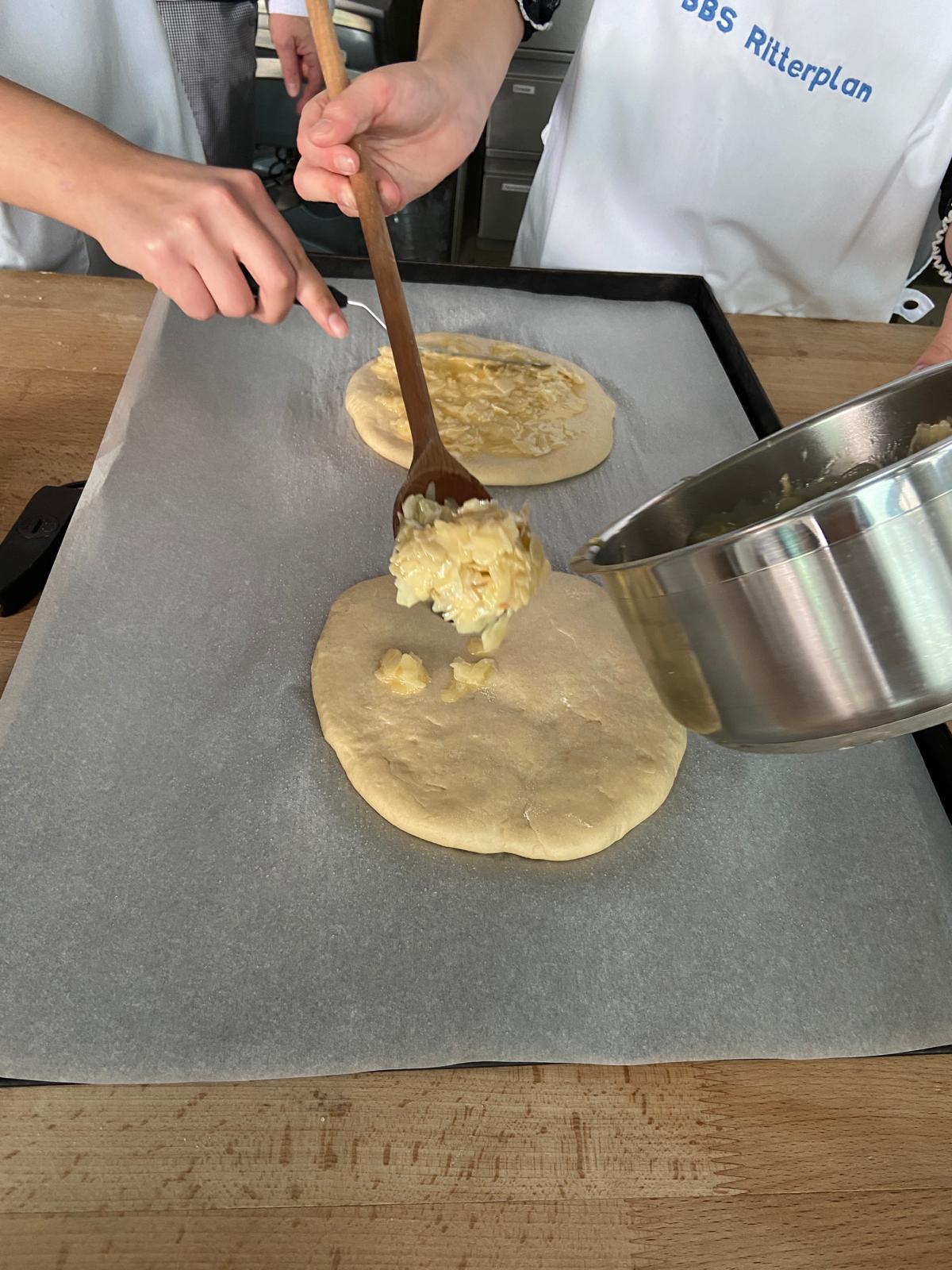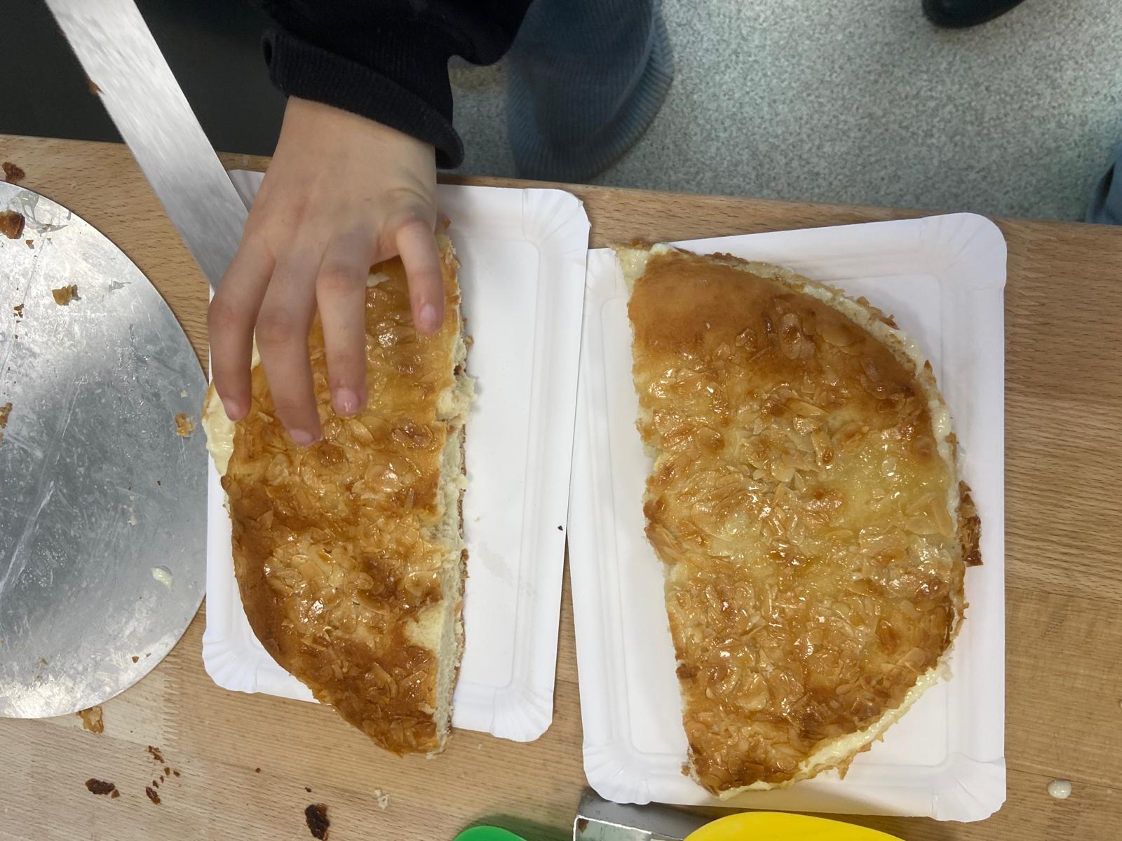 Ein weiteres Highlight war das Backen eines Bienenstichs mit Puddingfüllung. Dabei kombinierten wir mehrere Arbeitsschritte, wie das Herstellen des Hefeteigs, der Puddingcreme und des Mandelbelags. So konnten wir unser bereits erlerntes Wissen gut anwenden und vertiefen.