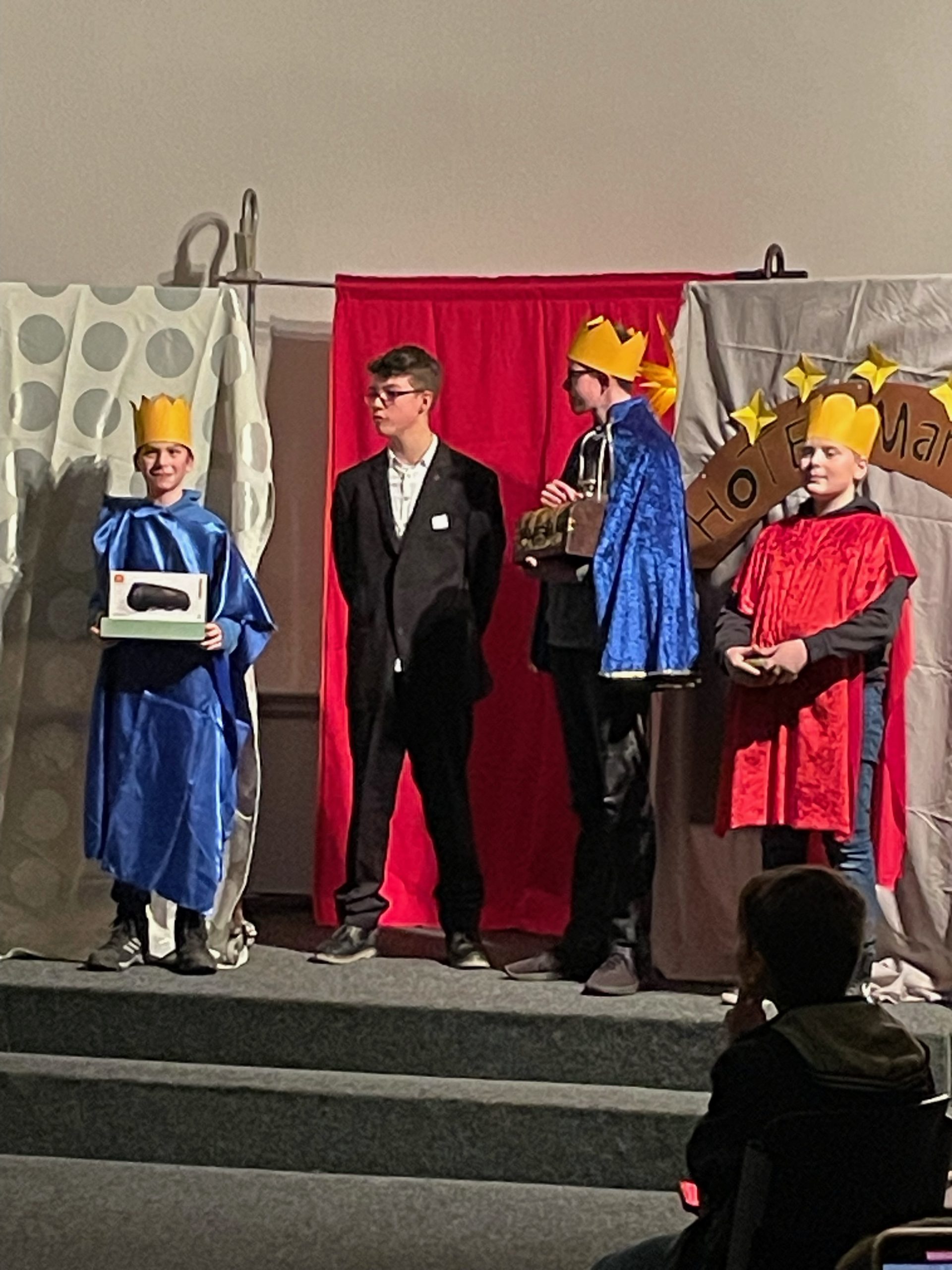 Die ganze 7b war beteiligt am Weihnachtsstück, geprobt und gestaltet mit Deutschlehrerin Frau Günther und uraufgeführt am 14.12.2023 zur Weihnachtsfeier in der Aula. Die Klasse hat das Stück modern bearbeitet, so gab es auch die Rolle des Regisseurs. Der protestierte heftig, als der Hotelmanager „das junge Paar“ doch noch unterbrachte, weil es das Kind Gottes erwartet und dieses dann auch noch ein Mädchen war. Nach einer Diskussion zwischen Josef und dem Regisseur (wir fanden das immer schon ungerecht, warum darf das denn kein Mädchen sein) spielten sie die Szene noch einmal – so wie man sie kennt.