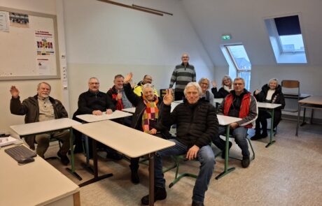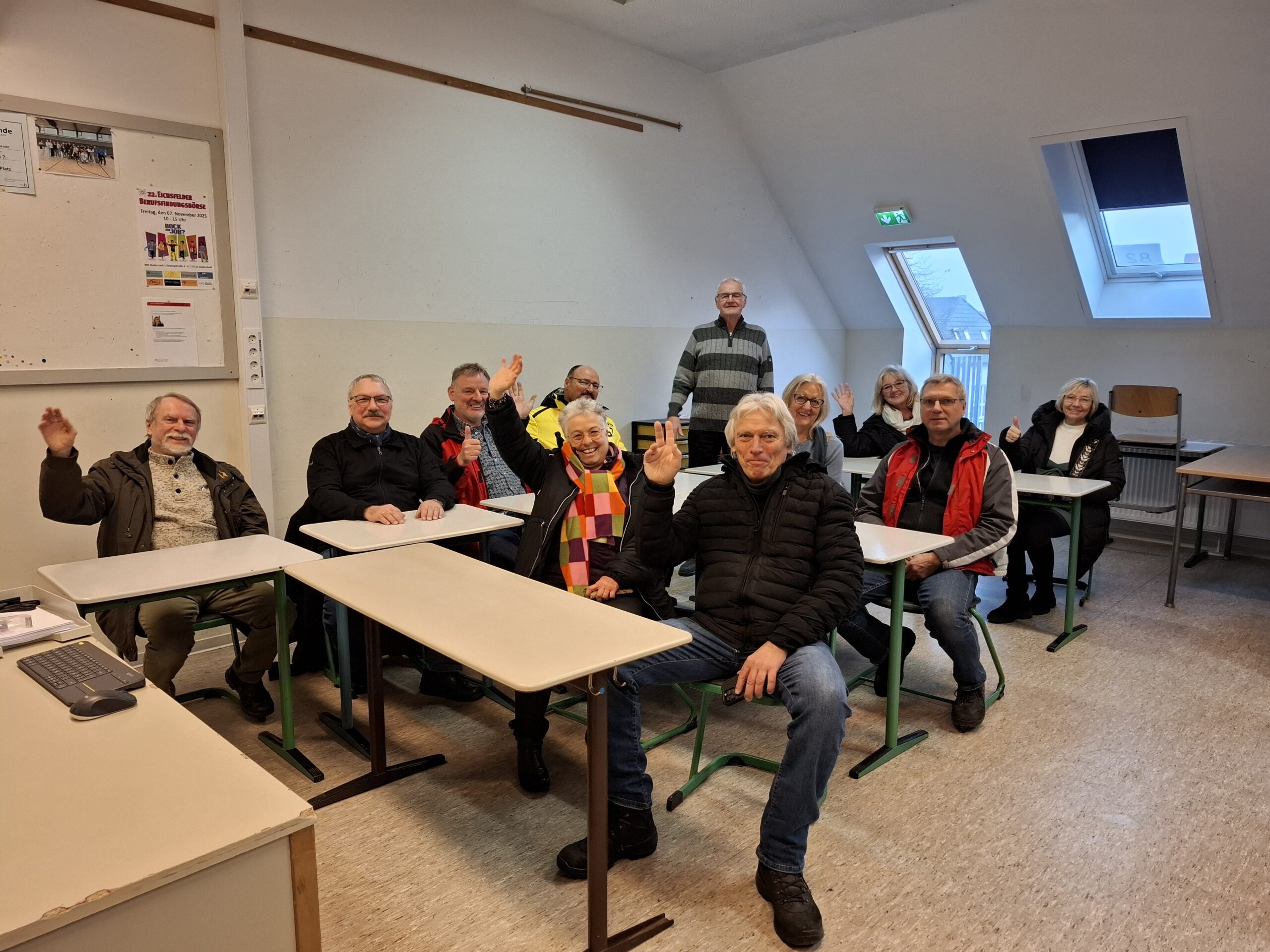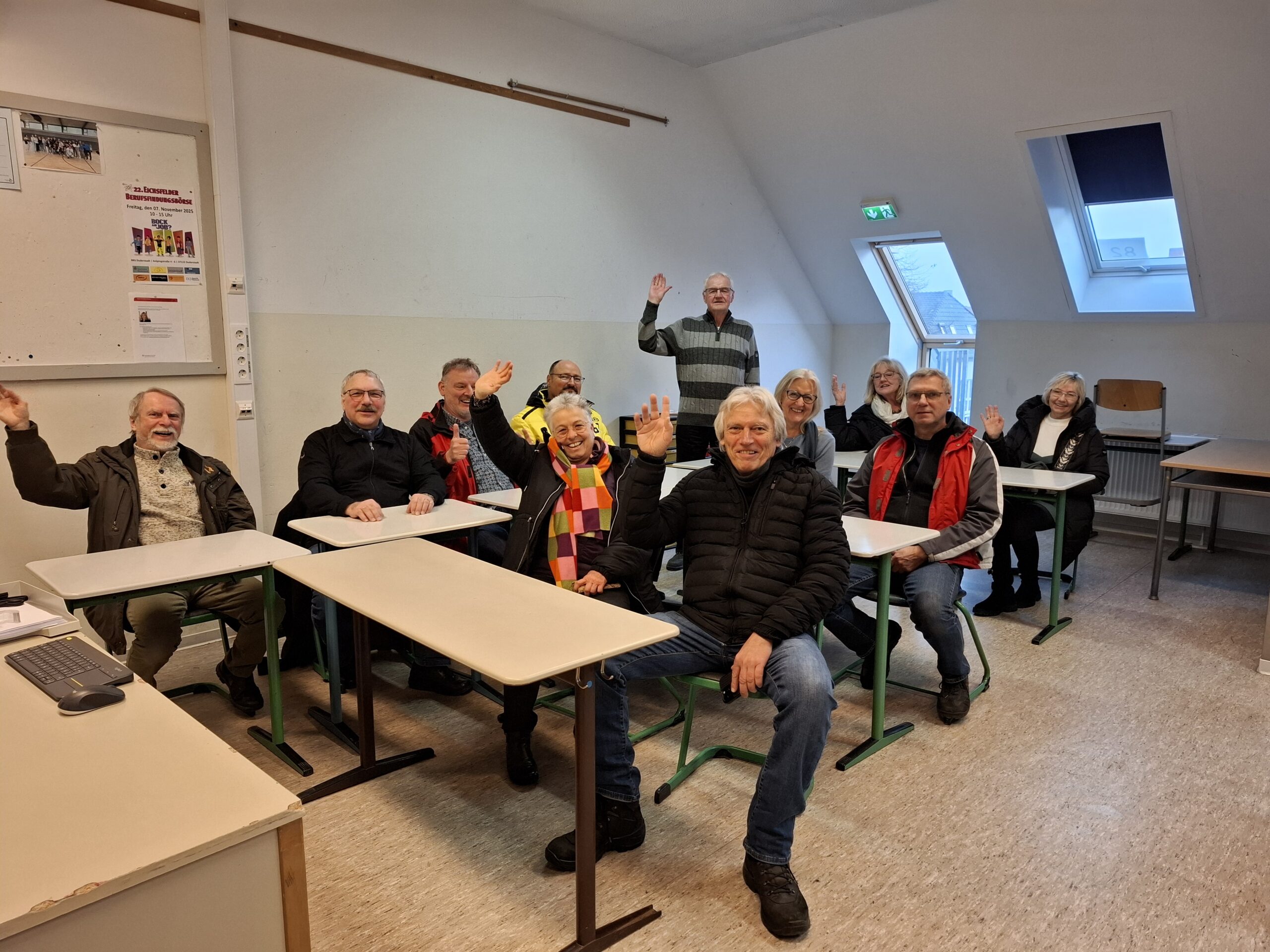 Gleich nochmal, nach 51 Jahren ihres Abschlusses an der Boni II trafen sich nach einem Jahr,erneut zunächst 10, am Abend dann 20 Schülerinnen und Schüler des Abschlussjahrgangs von 1975. Am 24.01.2026 versammelte sich die fröhliche Runde vor dem Hauptgebäude am Schildweg, um ihre alte Lernstätte, damals noch Hauptschule, an der man aber seitdem zum ersten Mal auch den Realschulabschluss machen konnte, noch einmal wiederzusehen und zu schauen, was noch wiederzuerkennen ist. Mit Michael Heider, langjähriger Lehrer und Sportfachleitung der Boni II im Ruhestand und Konrektorin Heike Heinemann-Ludwig erkundeten sie die Räume und konnten so manchen Schwank aus ihrer Schulzeit berichten. Anhand von alten Fotos konnten sie auch Klassenräume wiedererkennen, bevor sie sich zu einer Stärkung in ein Restaurant in die Stadt aufmachten.