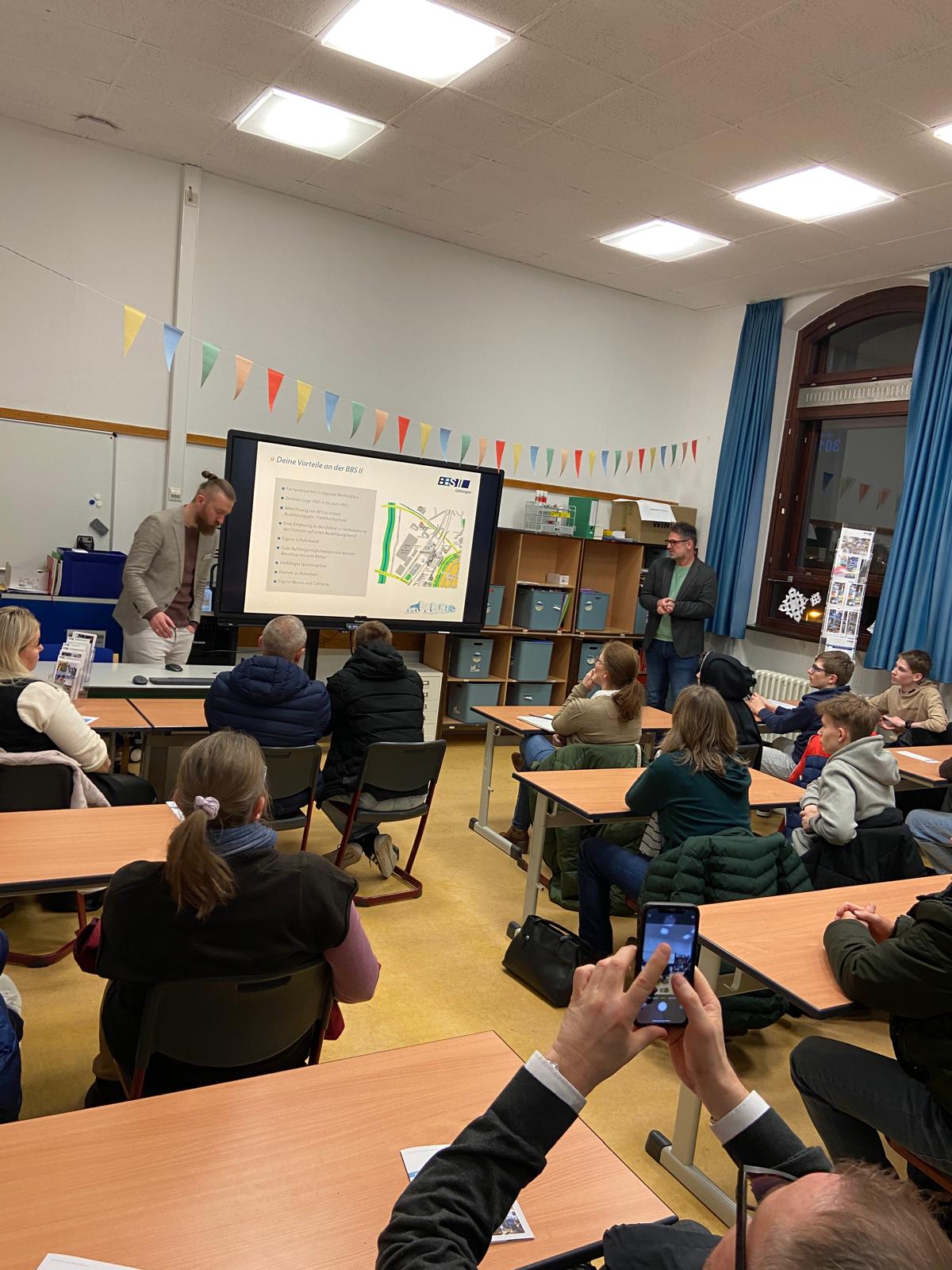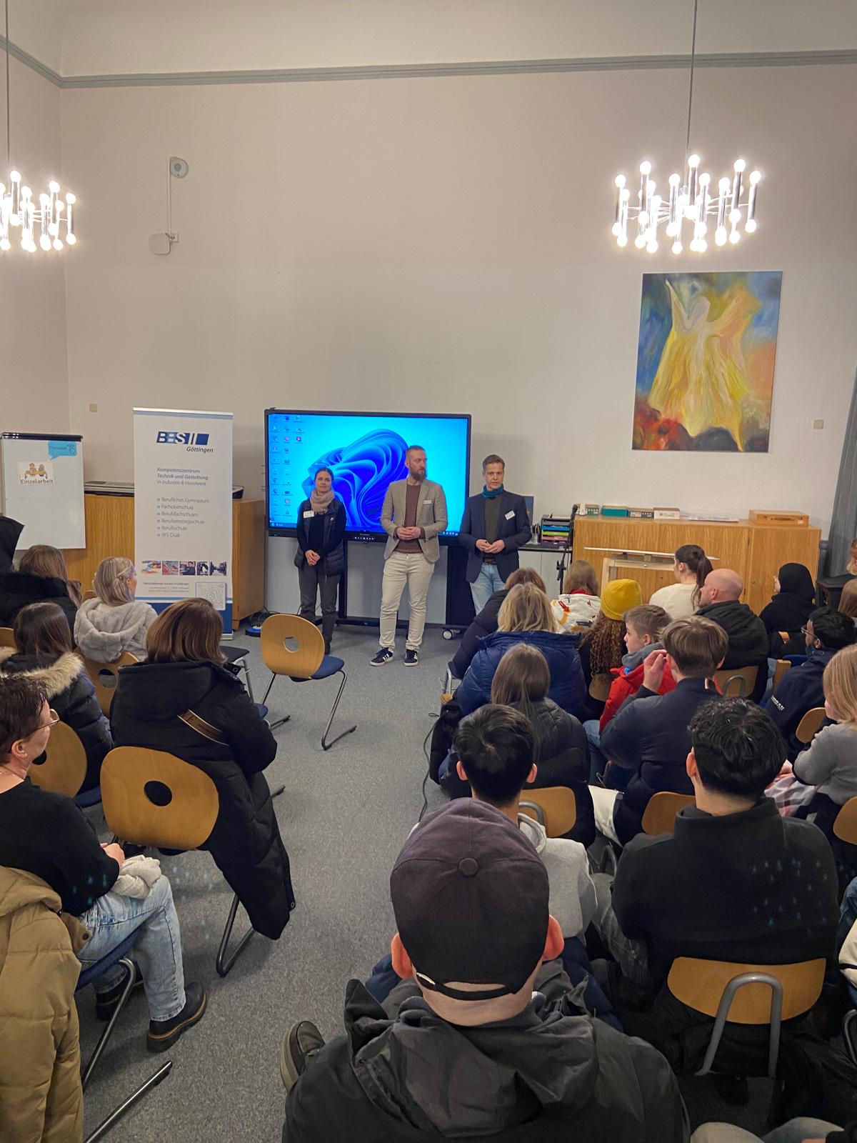 Diese und viele weitere Fragen konnten die Schülerinnen und Schüler der 9. und 10. Klassen unserer Schule am vergangenen Donnerstagabend in einer sehr gut besuchten Informationsveranstaltung in der Aula stellen, denn an diesem Abend stellten Vertreterinnen und Vertreter der drei Göttinger Berufsbildenden Schulen die unterschiedlichen Bildungswege  ihrer Schulen vor und standen den Schüler*innen und Eltern Rede und Antwort. Auch unsere Berufsberaterin, Frau Heinz, nahm an der Veranstaltung teil, erläuterte u.a. die Beratungsmöglichkeiten für Eltern und Schüler*innen und stand für persönliche Nachfragen zur Verfügung.